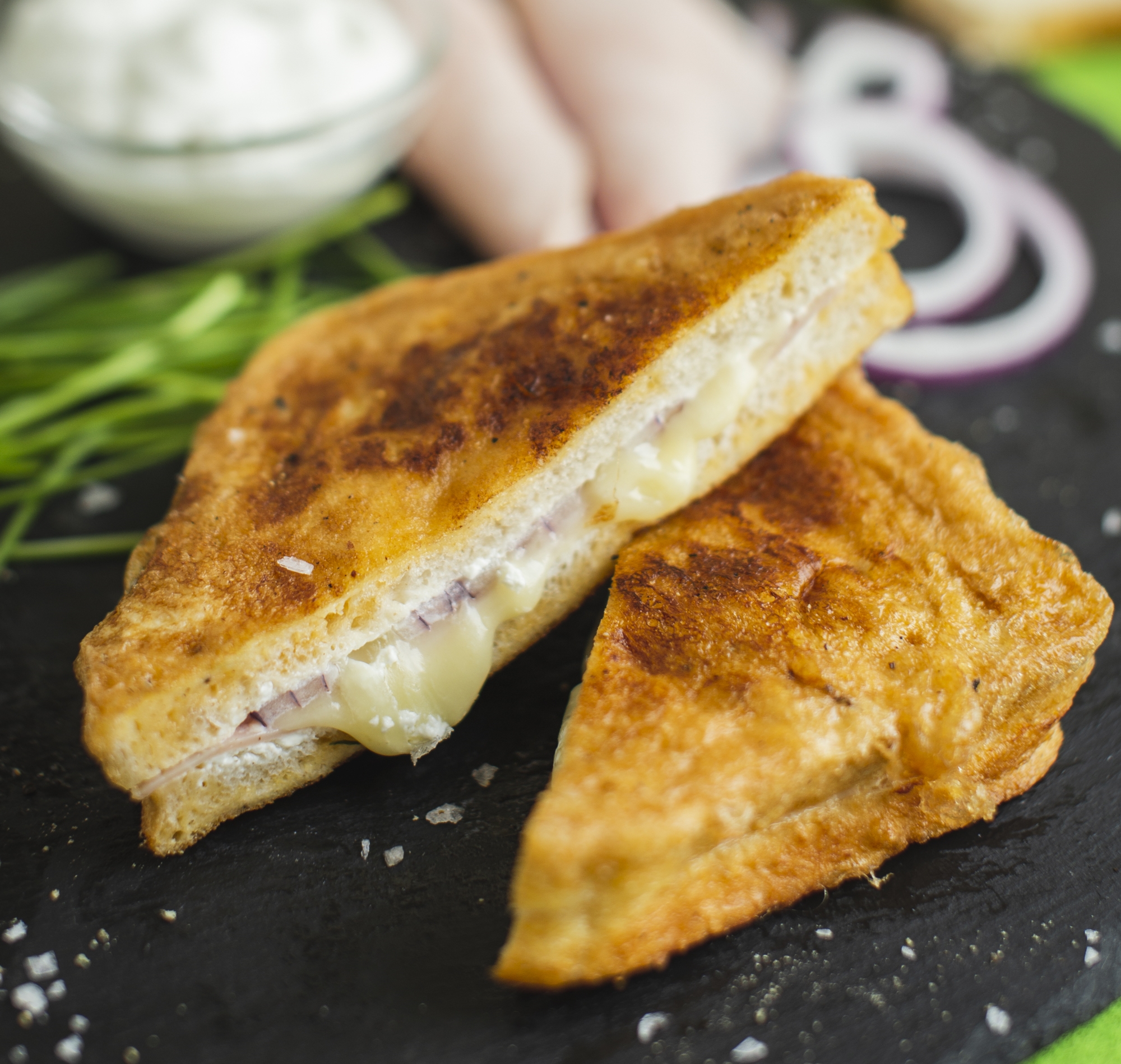 A fiaim imádják a bundás kenyeret, ezért nem telik el úgy hét, hogy ne sütnék nekik. Ha a szüleimhez utazunk el Pécsre, akkor is rendszeresen ez a reggeli menü. Egyik reggel szerettem volna kicsit felturbózni ezt az egyszerű finomságot, így sonkával, sajttal, tejföllel és egy kis lilahagymával töltöttük meg. Elképesztően finom lett, úgyhogy azóta rendszeresen együtt készítjük el ezt a szuper egyszerű reggelit.